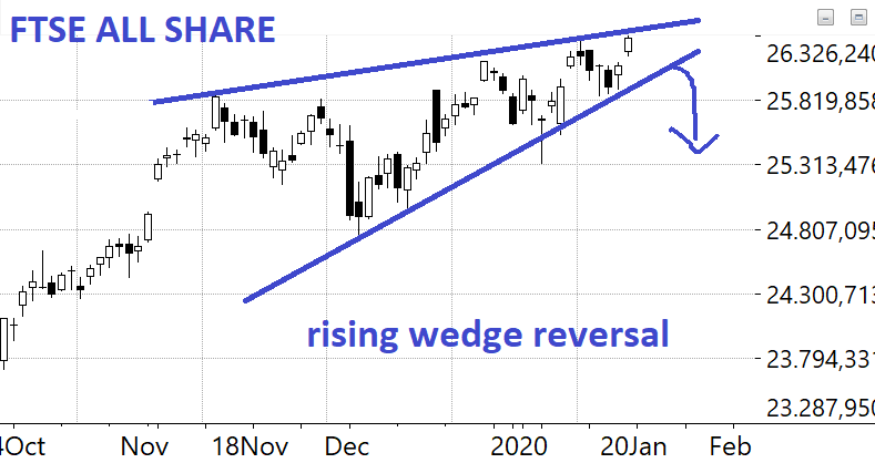 Perché venerdì scorso il nostro indice Ftse All Share ha completato quella che per taluni è la figura del “rising wedge reversal” per cui ora ci dobbiamo aspettare solo il reversal.
