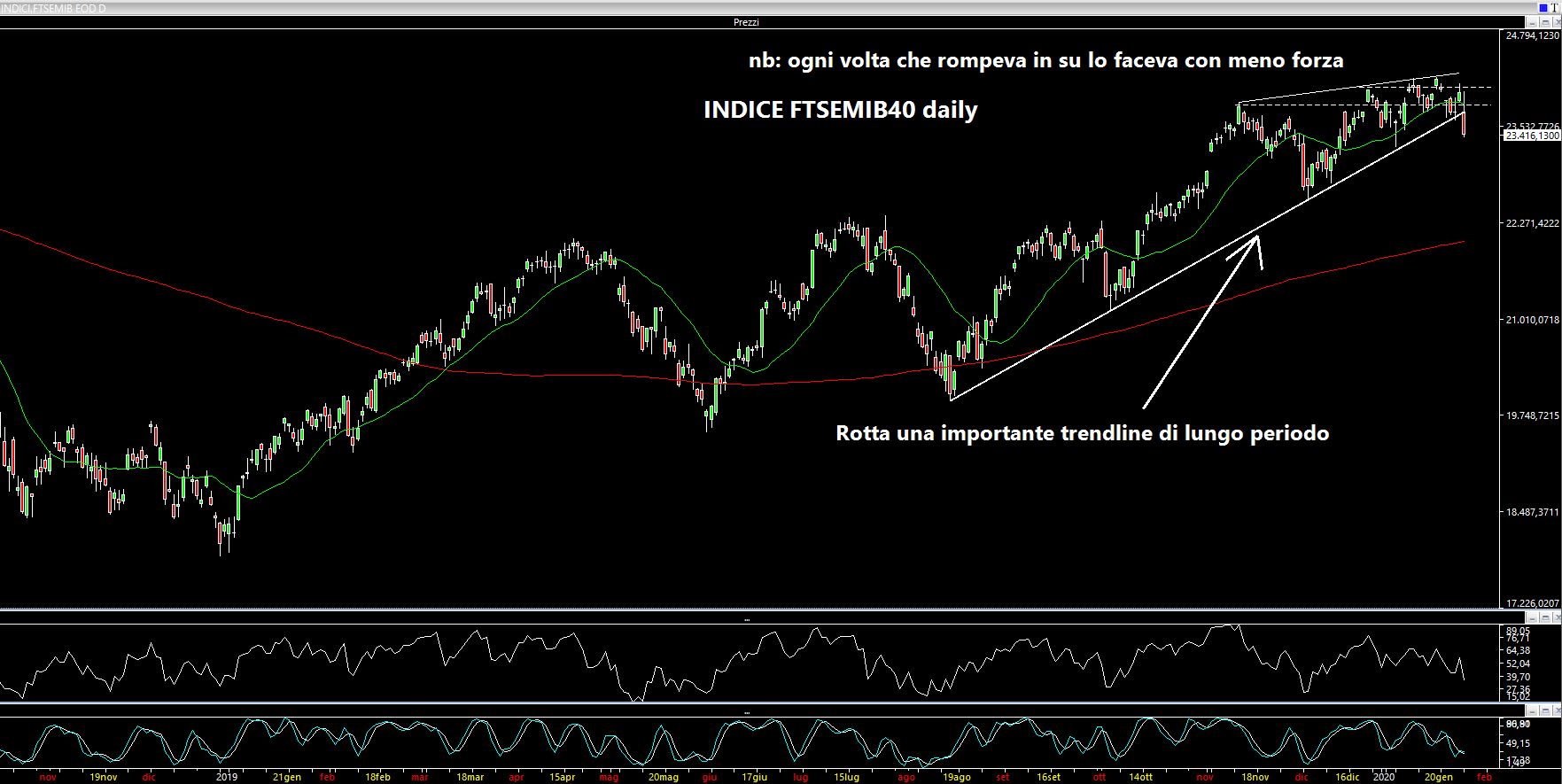 Sul chart daily è palesemente visibile la rottura decisa di una trendline dinamica che ha guidato tutto il rialzo da Agosto 2019 ad oggi e che spesso Vi ho mostrato nel consueto aggiornamento del fine settimana. Cosa aspettarsi ora? Come già scritto più volte da fine dicembre ad oggi, la ciclicità "impone" un assestamento sugli indici americani (quindi per la proprietà transitiva anche sulle altre Borse). Per assestamento non intendo necessariamente una inversione di trend ma semplicemente un movimento che permetta l'uscita di molti operatori long e possa favorire una netta diminuzione di questa fase di eccessiva compiacenza sui mercati.
