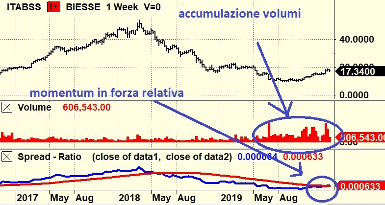 BIESSE: qualcosa bolle in pentola, i dati fondamentali sono interessanti, diciamo che è una azione nella fascia medio / alta del mercato per redditività e per costanza della stessa. I volumi sul mensile sono stratosferici mentre per la prima volta il momentum della forza relativa sull’indice di mercato è in accelerazione consistente. Non è la rottura del massimo relativo, è semplicemente un pattern di bottom up classico con congestione orizzontale nel 2019 e poi spike negativo e quindi rimbalzo. Il prossimo 13 marzo si riunisce il consiglio di amministrazione per l’approvazione del bilancio e ci potrebbero essere delle sorprese che già forse emergono tra i soliti “bene informati”. BUY 18.65 STOP