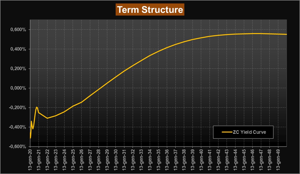 Torniamo alle nostre analisi, con la nostra consueta lettura del mercato obbligazionario attraverso la ZC-Yield Curve. Si contraggono un po’ i rendimenti rispetto alla nostra ultima analisi, ma senza particolari scossoni e poco influenzati dalle tensioni internazionali. I rendimenti sono ora negativi sino alle scadenze 2028; il tratto a lunga scende verso area 0,55% di rendimento per le scadenze 2050; anche sulla scadenza a 10 anni si lima qualcosa e si va in area 0,11%. La curva nel suo complesso mantiene le caratteristiche di ripidità (tratto medio-lungo) e nervosismo (parte a breve) ormai consolidate da tempo. Scendono un poco anche i forward su Euribor 6 mesi che sul tratto a lunga si portano poco sotto area 0,98% rispetto ad area 1,00% della scorsa rilevazione, mentre sul tratto a breve si rimane stabili in area -0,40%.