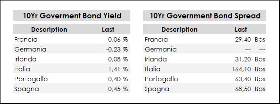 Sostanzialmente stabili i rendimenti dei governativi decennali e gli spread contro Bund, con movimenti molto lievi di aggiustamento che non cambiano il quadro complessivo. Il rendimento del decennale tedesco si mantiene in area -0,23%, il rendimento della Francia resta fermo allo 0,07% e quello dell’Irlanda si porta allo 0,08%. Ferma anche la Spagna che rimane allo 0,46% mentre ritocca un pelo il Portogallo che si porta allo 0,40%. Stabile anche il rendimento dell’Italia che resta poco sopra all’1,40%. A livello di spread Vs Bund abbiamo Portogallo, Spagna e Italia rispettivamente a 63 bps, 68 bps e 164 bps.