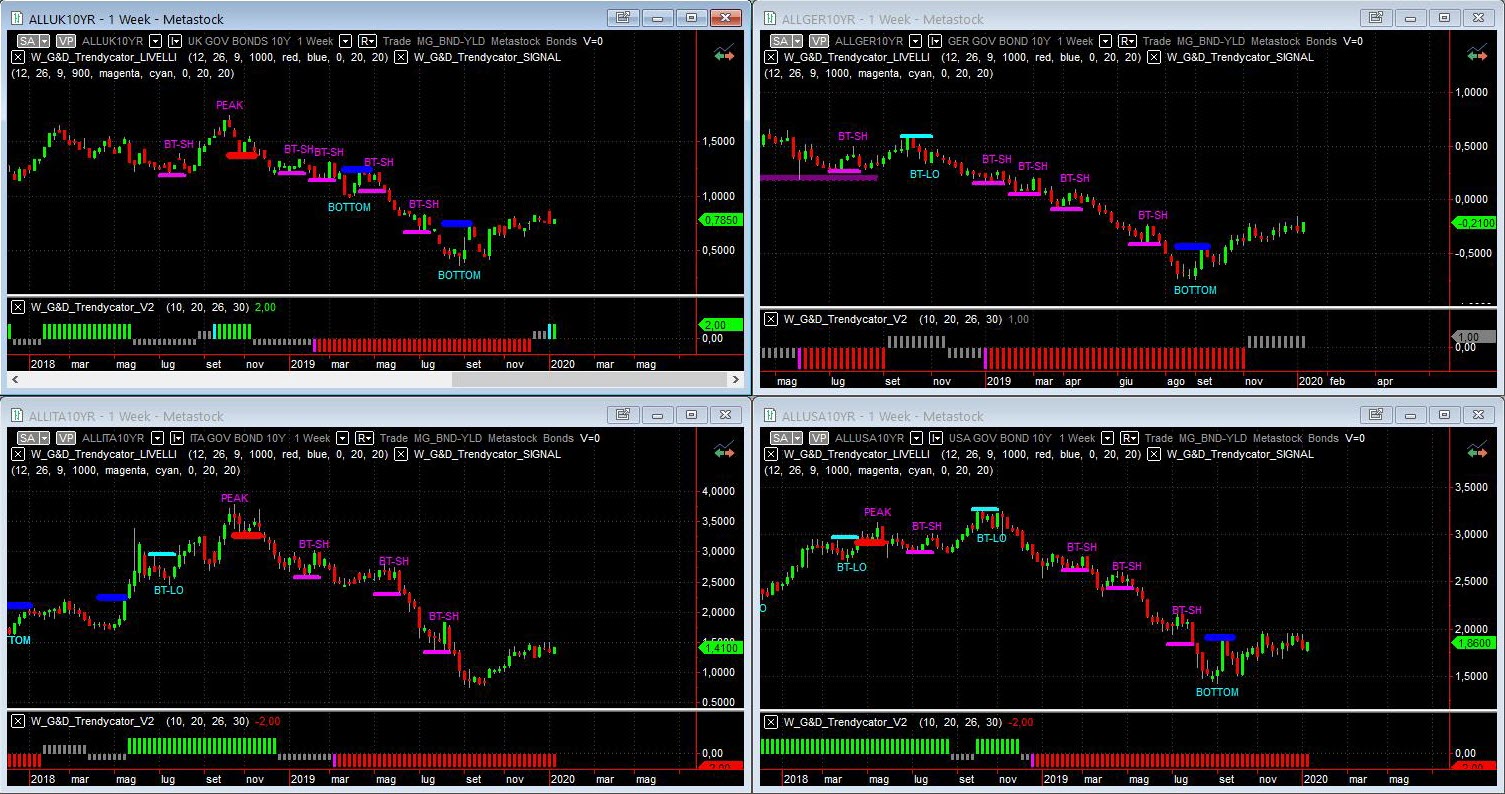 Osservando – a livello di analisi integrata – le curve dei rendimenti dei principali benchmark decennali si confermano anche in questa analisi tutte le evidenze sin qui riscontrate, cui si aggiunge un importante cambiamento per l’area UK. Il modello Trendycator si conferma sempre NEUTRAL sull’area BUND con il rendimento del decennale tedesco che gravita sempre nell’intorno di area -0,20% che, ricordiamo, rappresenta la resistenza chiave per un vero cambio di scenario. Cambio di scenario che è invece avvenuto sull’area UK, con Trendycator che diventa LONG con il Gilt ormai stabilmente sempre sopra area 0,80% di rendimento, che era livello spartiacque. Attenzione quindi ai bond anglosassoni che potrebbero iniziare a correggere sul serio. Sempre laterale il nostro Btp con il rendimento che balla ormai da diverse settimane nell’intorno di area 1,40% con Trendycator sempre SHORT; sostanzialmente stabili e di fatto laterali anche i rendimenti USA, con Trendycator che si mantiene SHORT sul decennale, e con rendimenti ora poco sotto area 1,90%.