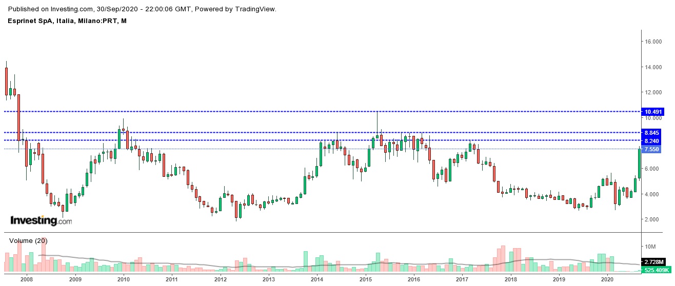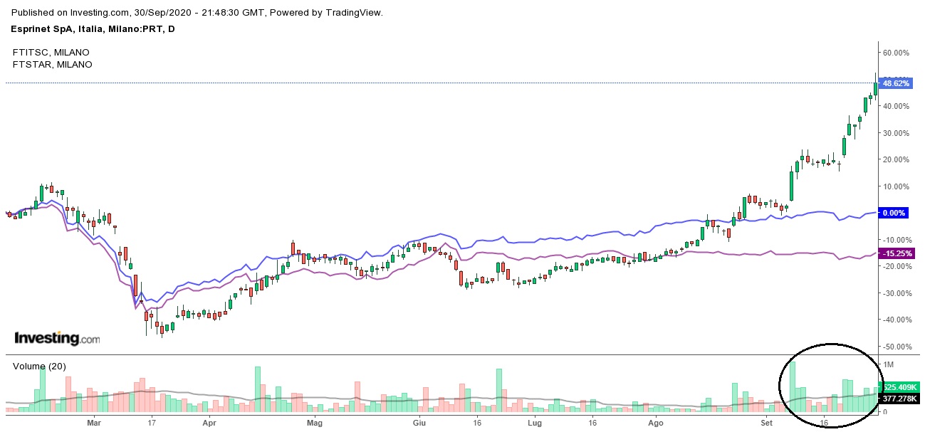 Il titolo, già impostato al rialzo dopo la fine del lockdown, all’uscita di queste notizie non poteva che brindare: tra agosto e settembre, acquistando forza relativa rispetto agli indici di riferimento (FTSE Italia STAR e FTSE Italia Small Cap), ha rotto un massimo relativo dopo l’altro.