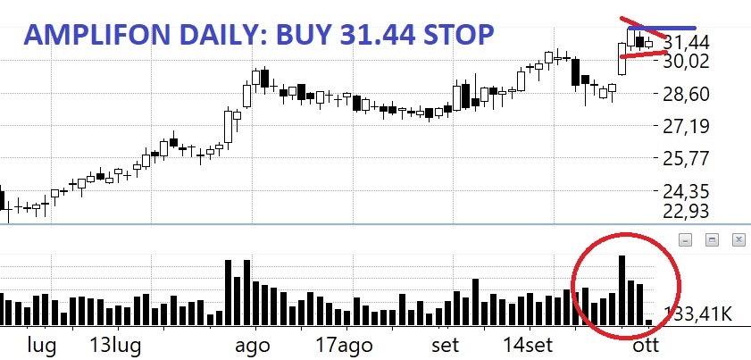 Mi piace moltissimo Amplifon perché sta disegnando la classica figura dell’ “uomo impiccato” ovvero piccola congestione stretta laterale in un movimento che l’ha portata sui massimi storici e noi ovviamente non aspettiamo altro per comprare: BUY AMPLIFON 31.44 STOP