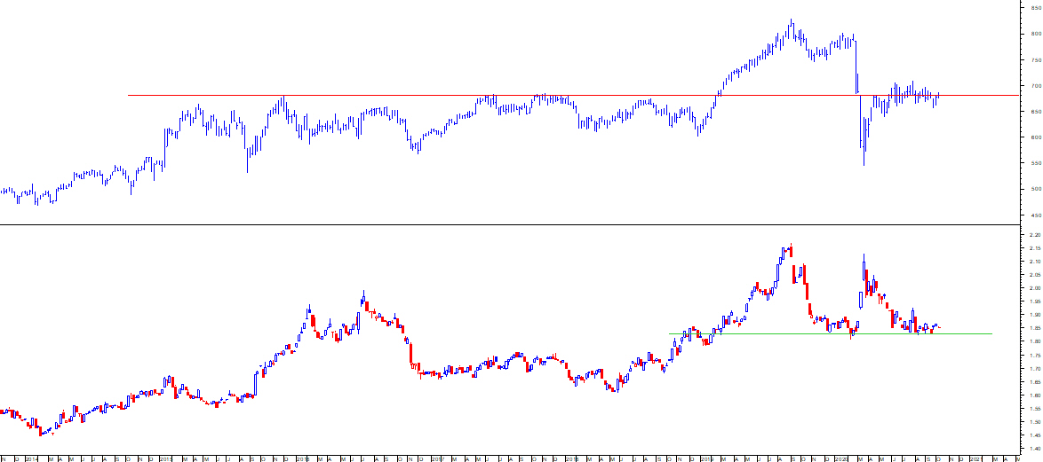 Dopo un parziale recupero il comparto consolida da qualche settimana in corrispondenza di un’importante resistenza statica, ricavata semplicemente dai picchi degli anni 2015/2018, e situata attorno a 680.