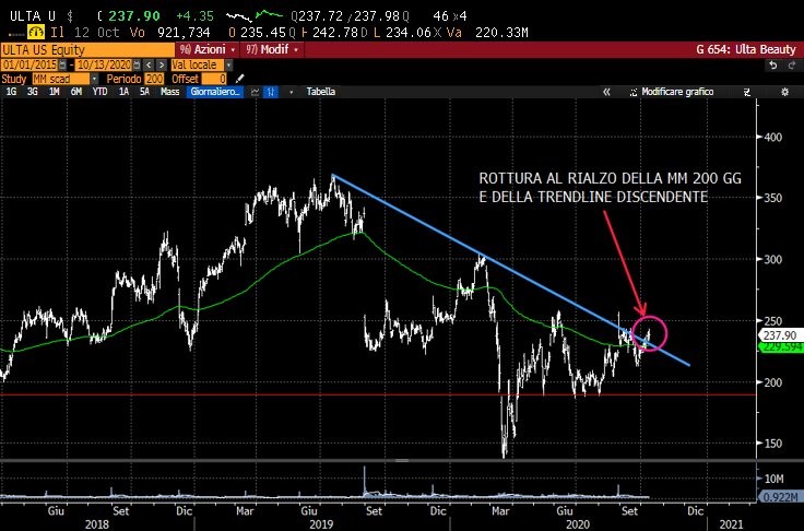 Al netto di quanto già descritto nell'analisi fatta lo scorso 29 Agosto (https://www.lombardreport.com/2020/8/29/il-prezzo-della-bellezza/), nella giornata di ieri si è verificata un'interessante rottura tecnica rialzista per ULTA BEAUTY.