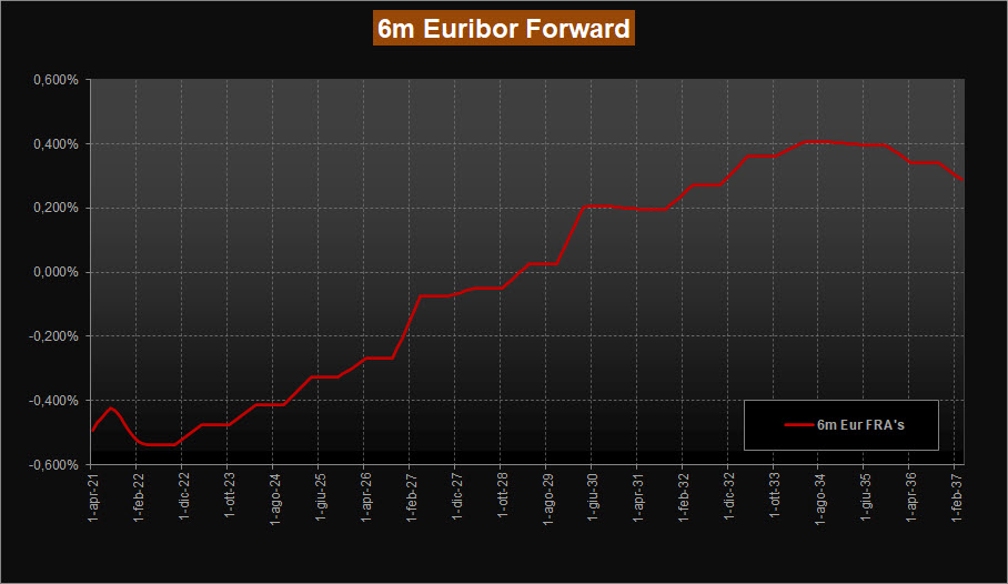 La lettura della ZC-Yield Curve, questa settimana, mostra una sostanziale stabilità dei rendimenti, con solo qualche lieve aggiustamento che non modifica nella sostanza la curva in analisi. Siamo ora con rendimenti negativi sino alle scadenze 2037; la scadenza a 10 anni, rimane a rendimento negativo, stabile in area -0,24% mentre la scadenza trentennale esce dal territorio negativo e si porta a 0,00% rispetto al -0,03% della scorsa rilevazione. Rimane stabile la forma della curva, sempre caratterizzata dalla ripidità acquisita nelle scorse settimane e con rendimenti decrescenti dalla scadenza 2044; la curva esprime ora il massimo rendimento poco sopra area 0,03% per le scadenze tra il 2043 e il 2045 in allargamento quasi impercettibile rispetto alla scorsa analisi. Leggermente più vistoso l’allargamento dei tassi forward su Euribor 6 mesi, che sul tratto a lunga si portano ora in area 0,40% per poi però degradare rapidamente, mentre il tratto a breve rimane sostanzialmente stabile sotto area -0,50%.