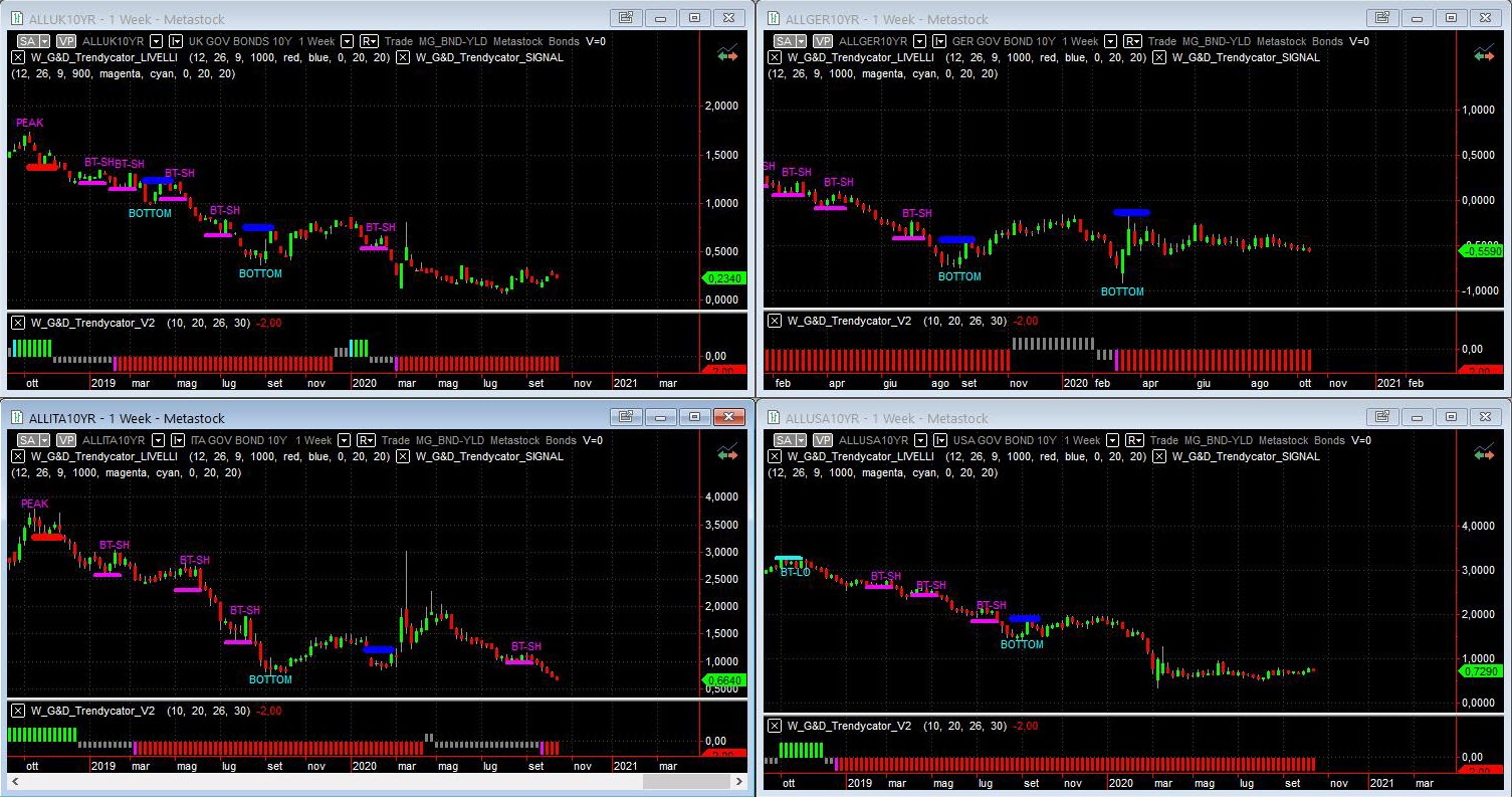 Osservando – a livello di analisi integrata – le curve dei rendimenti dei principali benchmark decennali, nulla di nuovo, come ormai da tempo immemore a questa parte. E come già abbiamo considerato più volte, al netto di eventi “esplosivi” inattesi, pare molto difficile che l’impostazione in ottica strategica possa mutare repentinamente. Così i rendimenti rimangono sui minimi, con Trendycator sempre SHORT sull’area UK, con i rendimenti ora poco sopra area 0,20%. Volatilità ormai inesistente il BUND, con il modello Trendycator piantato sullo SHORT e con il rendimento del decennale tedesco ora verso area -0,50% ma sempre in fase laterale. Momento da incorniciare per il nostro Btp, con i rendimenti che hanno registrato il minimo storico, ancora inferiori ai minimi di agosto/settembre 2019; lo spread è ormai avviato verso i 110 bps e il rendimento del decennale è ora in area 0,66% con Trendycator che consolida lo SHORT. Si muove un po’ l’area USD, ma non cambia molto la situazione di stasi con i rendimenti ora poco sopra area 0,70% con Trendycator sempre SHORT.