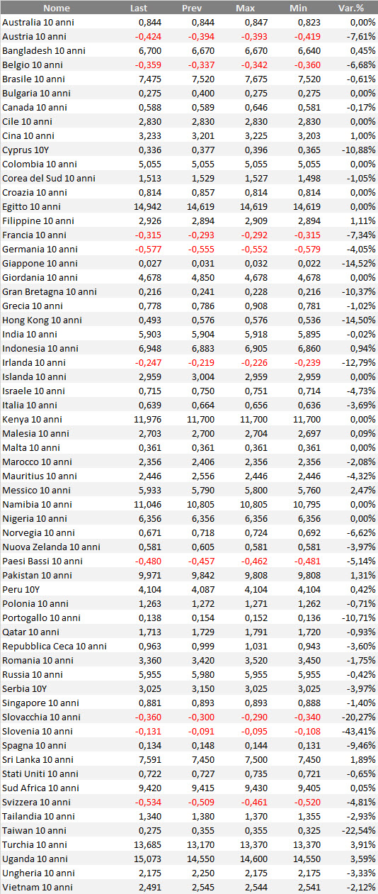 Analisi sotto forma di ranking dei bond governativi mondiali con qualunque rating. In alcuni casi, per alcuni emittenti o per alcune valute, il rapporto rischio/rendimento di questi bond può essere anche piuttosto speculativo. Il ranking considera i bond benchmark decennali in tutte le valute di emissione.