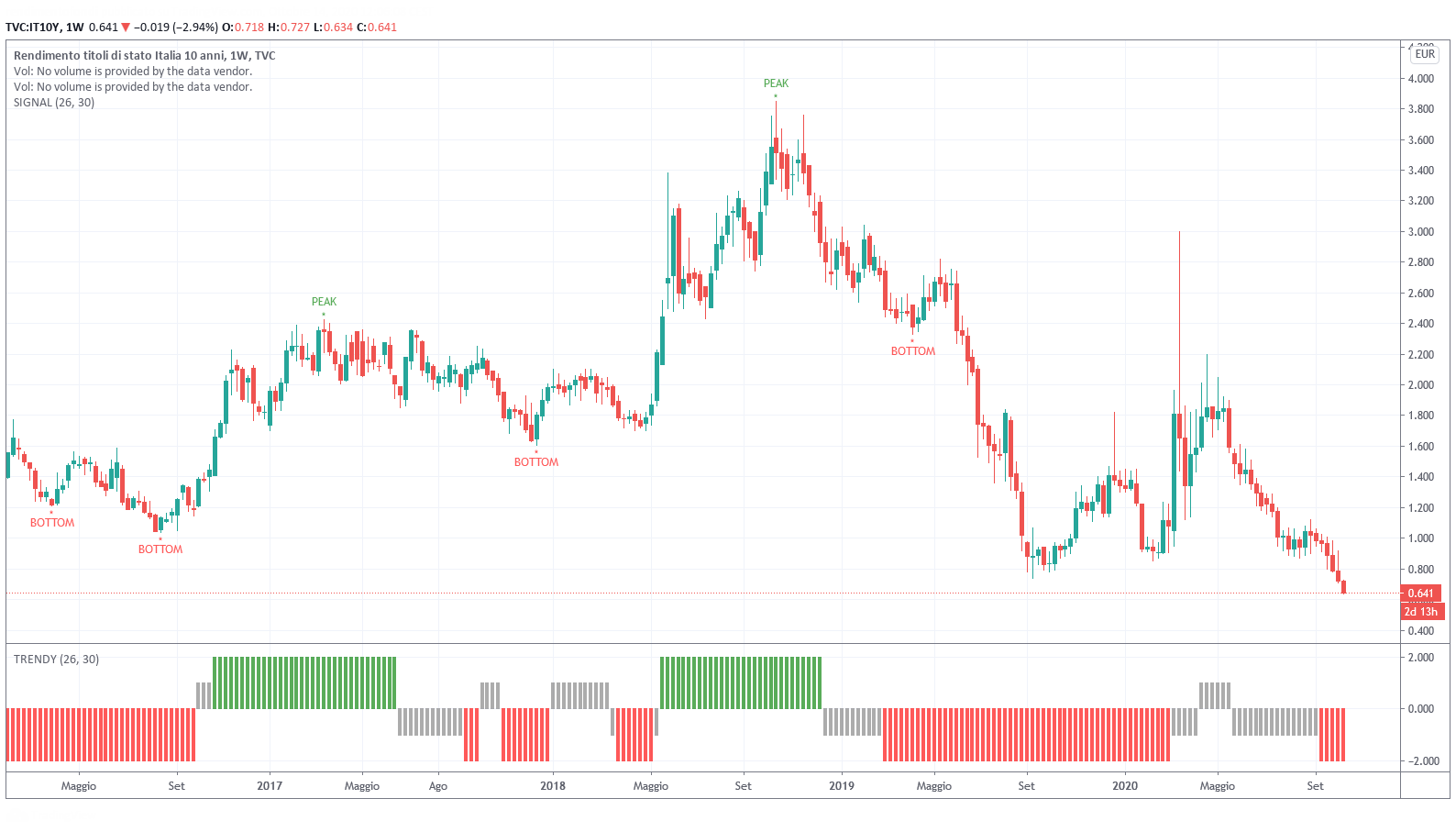 Ecco quindi che poiché, chi più chi meno, qualche Btp in portafoglio lo abbiamo tutti, è bene seguire da molto vicino il modello Trendycator oltre che le dinamiche sia del flusso dei prezzi sia del flusso delle notizie che arrivano dal fronte europeo. A livello di rendimento, un ritorno sopra 0,80% è un primo segnale di allerta e ovviamente un Trendycator che dovesse tornare grigio suggerirebbe di alzare la guardia.