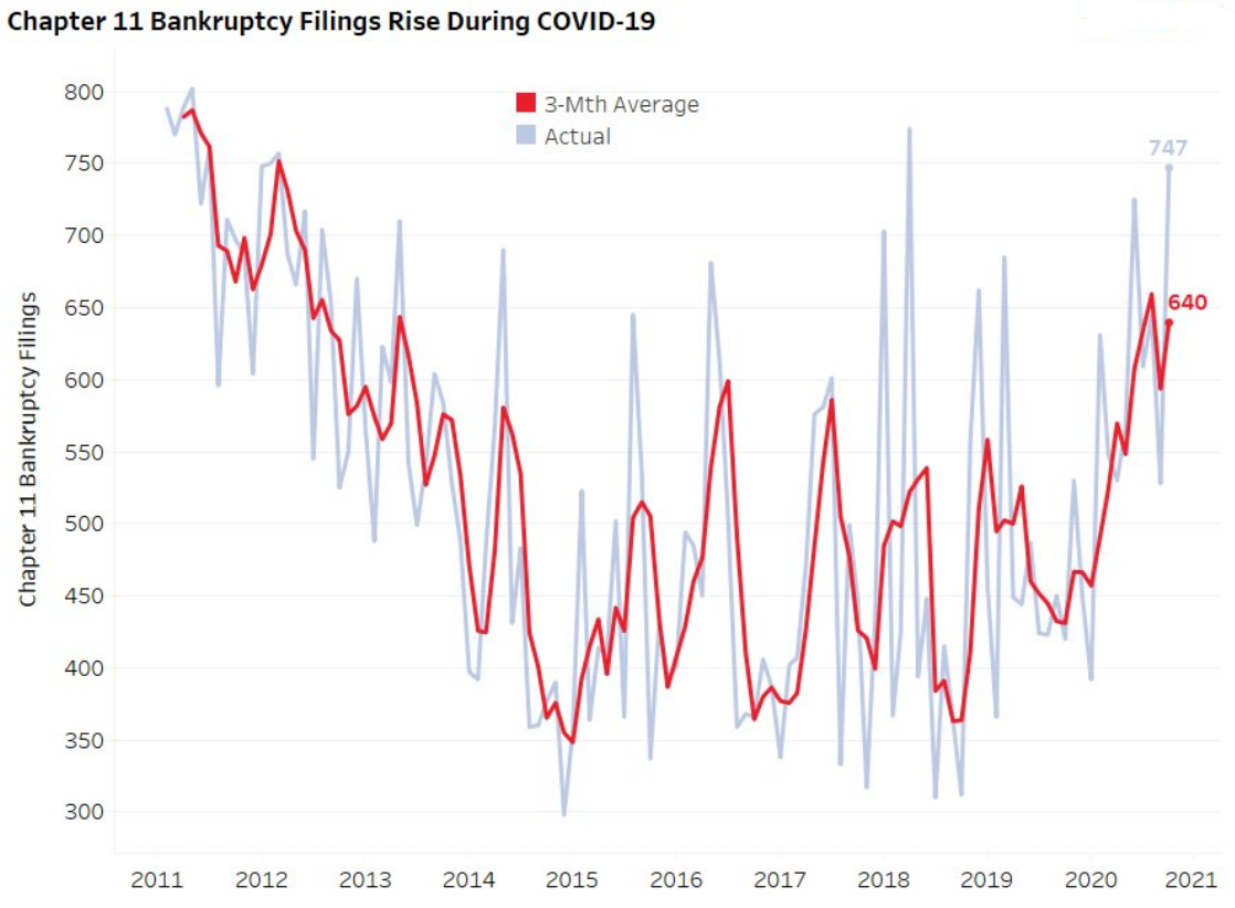 Inizio di settimana sfavillante per i mercati azionari USA con tanto di apertura in gap up ma, poi, tra le consuete manfrine sul “fiscal cliff” tra Repubblicani e Democratici delle quali parleremo in seguito e l’avanzata lenta, ma inesorabile, dei contagi da COVID-19 con picchi tra Ohio, Michigan e Wisconsin, hanno avuto la meglio nel sentiment e sono seguite tre giornate negative e solo nella giornata di venerdì si è intravisto un minimo recupero del sentiment dovuto all’uscita dell’ottimo dato mensile sulla spesa in beni di consumo; insomma gli americani spendono. Come detto, oltre al “fiscal cliff” che, comunque, prima o dopo si attuerà, c’è da notare che più si ritarderà nel tempo e più consistente dovrà essere l’importo totale in quanto, ed ecco un’altra fonte di preoccupazione, è costante la crescita dei defaults aziendali (v. grafico).