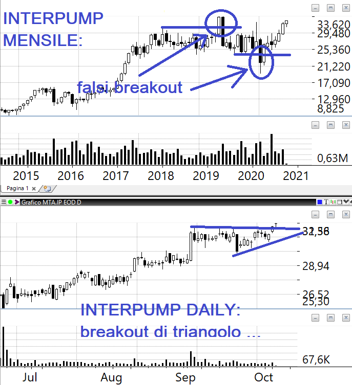 INTERPUMP: una delle società più solide del nostro listino ed oggetto in passato di diverse scorribande nostre, delle quali le ultime due in perdita. Da allora l’abbiamo lasciata nell’angolo volutamente aspettando che un giorno arrivasse il tanto sospirato giorno del breakout da quella che sembra essere una congestione orizzontale poliannuale. A questo punto temiamo soltanto il falso breakout, il cui precedente al ribasso è stato esiziale per chi lo avesse seguito. Da monitorare con attenzione, tanto più che nonostante la difficile situazione del primo semestre i conti sono in diminuzione ma provenendo da una situazione eccezionale sono tutto sommato sempre e comunque invidiabili: ricavi per 639,54 milioni di euro, in contrazione del 9,1% rispetto ai 703,2 milioni realizzati nei primi sei mesi dello scorso anno. A parità di perimetro di gruppo e di tassi di cambio, il fatturato sarebbe sceso del 18,7%. In contrazione il margine operativo lordo (-14,1%), che è passato da 162,18 milioni a 139,25 milioni di euro; di conseguenza, la marginalità è scesa dal 23,1% al 21,8%. Interpump ha chiuso lo scorso semestre con un utile netto (esclusa la quota di terzi) di 62,52 milioni di euro, rispetto ai 91,51 milioni contabilizzati nei primi sei mesi del 2019, in conseguenza all'aumento dei costi operativi e degli oneri finanziari. Nel solo secondo trimestre i ricavi del gruppo sono saliti del 17,8% a 295,57 milioni di euro, mentre l'utile netto è sceso a 29,38 milioni. I vertici di Interpump hanno segnalato che nelle settimane successive alla chiusura del semestre si registrano segni di ripresa degli ordinativi, che se confermati nei prossimi mesi potrebbero essere indicativi di un ritorno verso normali livelli di business.
