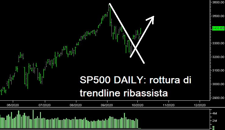 Il dato di fatto ad oggi tuttavia è che siamo al rialzo e posto il grafico dell’indice degli indici, l’SP500, per dimostrarlo: