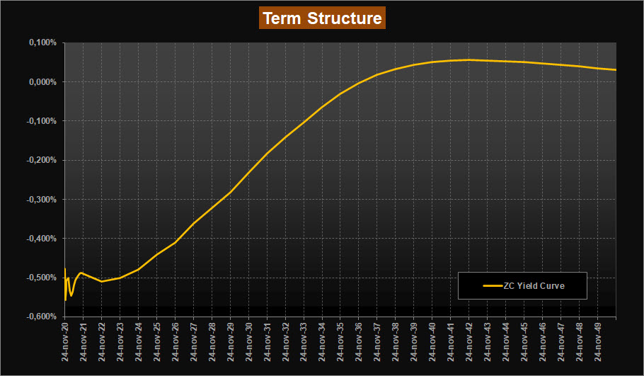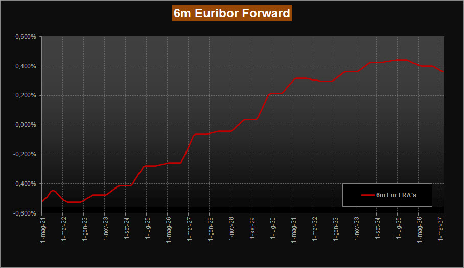 La lettura della ZC-Yield Curve, questa settimana, mostra una lieve risalita dei rendimenti, più accentuata sul tratto a lunga. Dopo alcune settimane di curva “sott’acqua” con rendimenti negativi per tutte le scadenze, questi tornano ad allargarsi di qualche bps, ma senza cambiare minimamente il quadro complessivo. La scadenza a 10 anni pur rimanendo in territorio negativo vede ora il suo rendimento in area -0,23% mentre la scadenza trentennale torna in positivo e passa dal -0,03% allo 0,03% di rendimento. Rimane stabile la forma della curva, come la osserviamo ormai da diverso tempo, ripida il giusto sino alle scadenze 2038-2040 per poi presentare rendimenti decrescenti a partire dalla scadenza 2043; la curva esprime ora il massimo rendimento poco sopra area 0,05% per le scadenze 2042-2043 in leggera salita rispetto alla scorsa rilevazione. In leggera salita anche per i tassi forward su Euribor 6 mesi, che sul tratto a lunga sono ora poco sopra area 0,40% rispetto allo 0,30% della scorsa analisi, e con il tratto a breve che si porta più vicino ad area -0,50%.