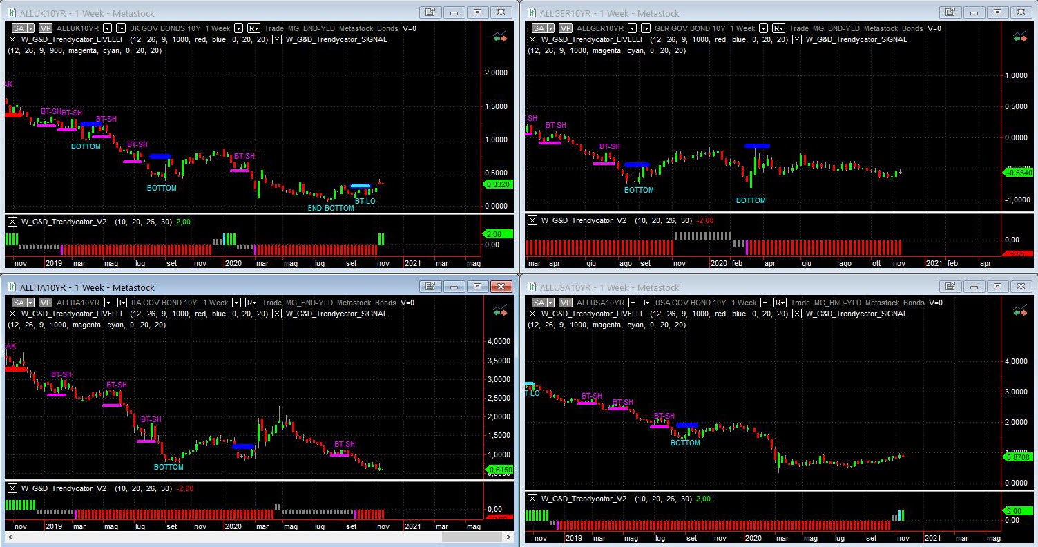 Osservando – a livello di analisi integrata – le curve dei rendimenti dei principali benchmark decennali, si confermano i cambiamenti in divenire per l’area UK e l’area USA, mentre nulla cambia per l’area Euro. Sull’area UK i rendimenti superano la resistenza in area 0,30% e strappano fino a 0,40% per poi assestarsi poco sopra 0,30% facendo anche ambiare lo stato del modello Trendycator direttamente da SHORT a LONG. Riprende la sua lateralità il BUND, con il modello Trendycator stabilmente SHORT e con il rendimento del decennale tedesco in altalena tra area -0,60% e area -0,50%. Ancora bene il nostro Btp, con i rendimenti che hanno ripreso a contrarsi con costanza, grazie anche allo spread ridimensionatosi a 120 bps; il rendimento del decennale è ora nei pressi dello 0,60% con Trendycator sempre SHORT per la nona settimana consecutiva. Confermato il cambia dell’impostazione degli USA, dopo l’esito delle elezioni che hanno visto trionfare Biden: i rendimenti hanno infatti proseguito la marcia al rialzo e ora gravitano poco sotto area 0,90% con Trendycator che dopo due anni ha definitivamente abbandonato lo SHORT e diventa LONG. Prime avvisaglie di un cambio in ottica strategica, anche se un po’ in contrasto con la politica monetaria della FED. Da osservare con attenzione.