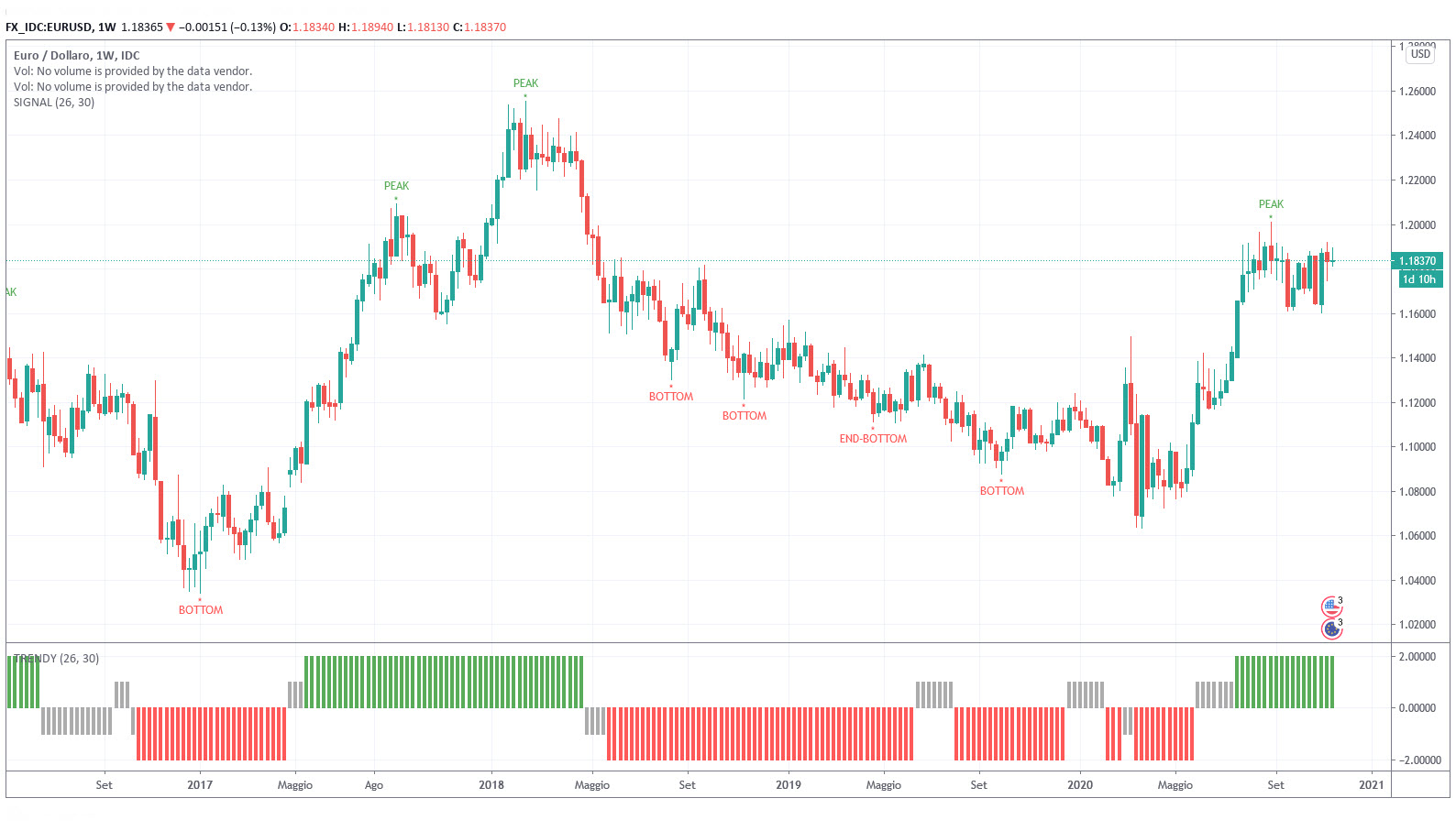 Del decennale abbiamo già detto nella sezione dedicata all’analisi integrata Trendycator, per cui qui ci occupiamo del cambio EUR/USD, dato che se i rendimenti dei governativi dovessero anche crescere lentamente potremmo agire sulla “leva” del cambio. Infatti, è al momento difficile credere che i T-Bond possano vedere i rendimenti decisamente in alto, vista la politica monetaria della FED.