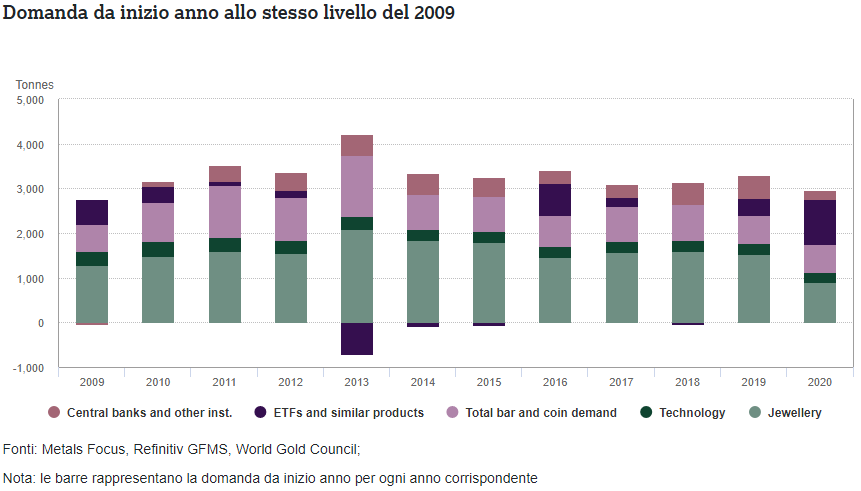 La domanda di oro è scesa a 892,3 tonnellate nel terzo trimestre, il totale trimestrale più basso dal terzo trimestre del 2009, poiché consumatori e investitori hanno continuato a combattere gli effetti della pandemia globale. Con 2.972,1 tonn. da inizio anno, la domanda è inferiore del 10% rispetto allo stesso periodo del 2019. Sebbene la domanda di gioielli sia migliorata dal minimo record del secondo trimestre, la combinazione di continue restrizioni sociali, rallentamento economico e un forte prezzo dell'oro si è rivelata onerosa per molti acquirenti di gioielli: la domanda di 333 tonn. è stata inferiore del 29% rispetto al terzo trimestre del 2019, già relativamente anemico.