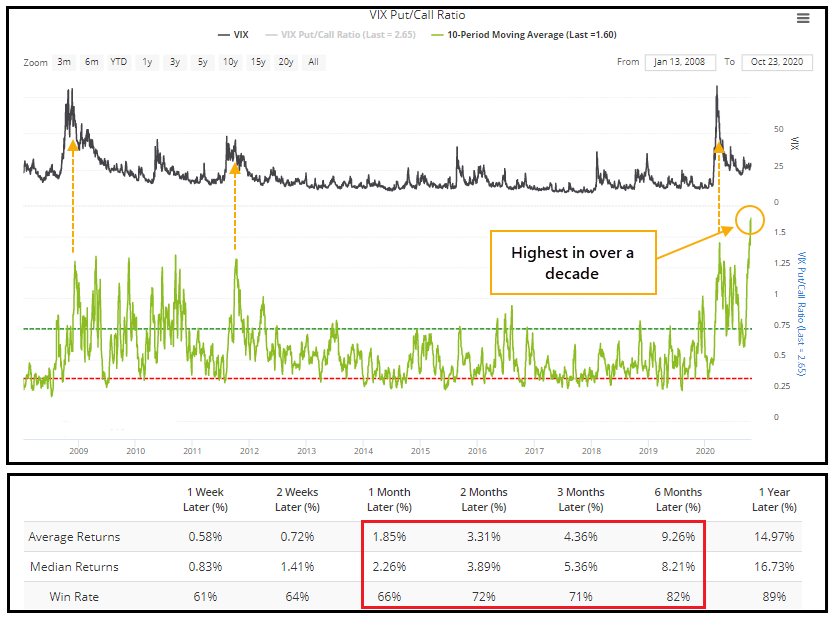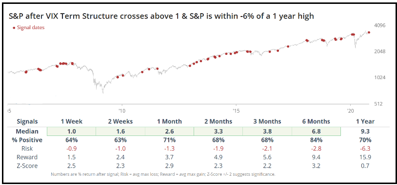 Come detto, l'abbondanza di incognite del periodo, tra Coronavirus, elezioni, fiscal cliff ed altro (stagione delle trimestrali economiche) ha mantenuto il Vix (indice che esprime l'andamento della volatilità implicita delle opzioni sull'indice S&P 500) su livelli storicamente elevati (>25) nonostante gli alti livelli attuali dell'azionario e la discesa della volatilità realizzata. Questo è abbastanza raro. Negli ultimi giorni il ritorno della volatilità ha prodotto un violento rialzo da questi livelli (+40% solo in questa settimana), anche questo è un evento raro partendo da una base così alta. Negli ultimi 30 anni movimenti del genere, con l'S&P a meno del 10% dai massimi, si sono avuti in appena 14 occasioni. I ritorni prospettici per l’indice S&P500 a 2 e 8 settimane si sono rivelati buoni e migliori della media. Solo in 2 casi si sono osservate perdite nei 3 mesi successivi (aprile 2000 e novembre 2007) (v.grafico):