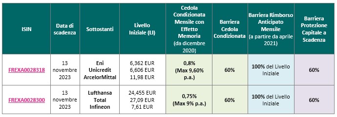 Naturalmente si tenga conto del fatto che in entrambi i casi si ha nei sottostanti un’azione potenzialmente più debole: ArcelorMittal nel primo e Lufthansa nel secondo. Le scadenze appaiono un po' lunghe ma l’effetto memoria per le cedole sono una garanzia in più. Attenzione infine agli eventuali rimborsi anticipati.