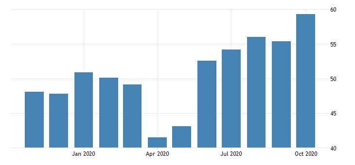 L'indice PMI dei servizi, prodotto da Markit Economics, nel mese di ottobre sale a 56,9 punti, battendo gli analisti che lo davano a 56 punti e battendo anche il mese di settembre, dove il dato era di 54,6 punti; gli stessi dati a cura dell’ISM recitano viceversa una discesa a 56,6 dai 57,8 di settembre e dai 57,5 del consensus.