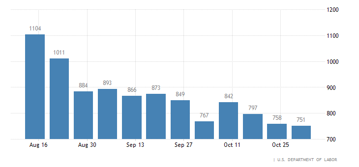 Le nuove richieste di sussidi di disoccupazione nella settimana conclusasi il 5 novembre, registra un miglioramento di 751 mila nuove richieste, rispetto alla settimana precedente di 758 mila, rimane sopra le stime degli esperti che si aspettavano 732 mila nuove richieste di disoccupazione ma, comunque, il trend resta migliore di quanto si ritenesse fino a qualche settimana fa.
