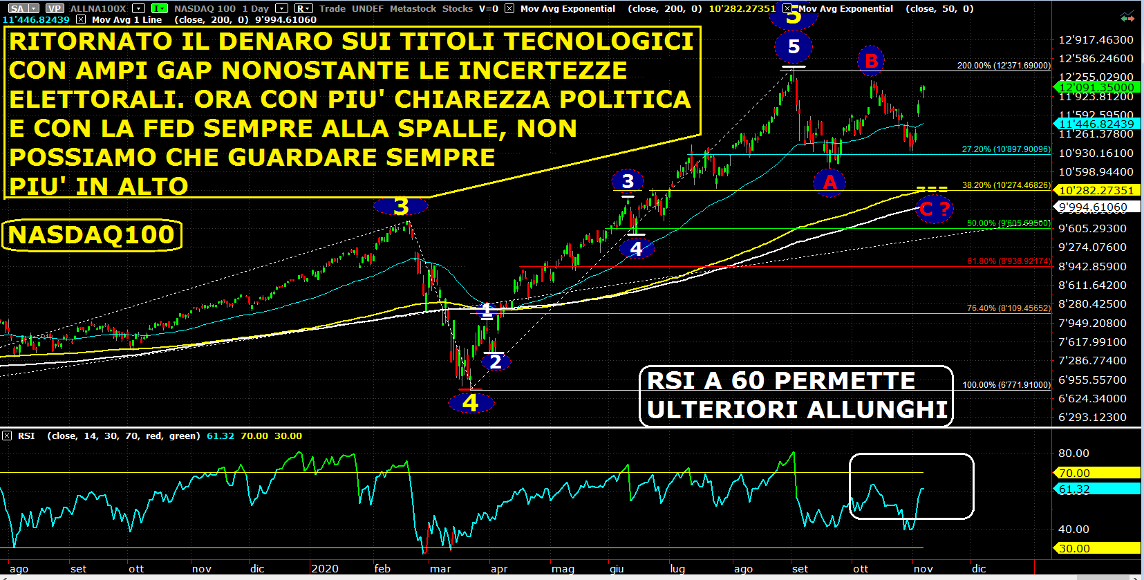 Analizziamo ora graficamente la settimana sui 3 principali indici azionari iniziando, come sempre, dal NASDAQ100. Sorprendente balzo al rialzo dell’indice tecnologico nonostante le incertezze del voto elettorale. Le trimestrali economiche societarie continuano ad essere positive, anche se le aspettative degli analisti di Wall Street erano molto caute. Graficamente, anche se il modello presentato è ancora valido, manca molto poco per un nuovo conteggio a meno di stravolgimenti importanti già da lunedì prossimo. L’area psicologica di 11000/10900 nonché ritracciamento del 27,2% dal minimo di marzo al massimo storico di settembre, ha tenuto molto bene. Ora, al rialzo, gli obiettivi sembrano molto più facili da raggiungere, quali il superamento dell’area 12200 dello scorso ottobre, quindi l’attacco al massimo storico di inizio settembre a 12439. Il livello di RSI a 61 permette ulteriori decisi rialzi prima di entrare in area ipercomprato. La settimana si è chiusa a 12091.35 con un guadagno del + 9,39% che porta il segno positivo da inizio 2020 al + 38,45%.