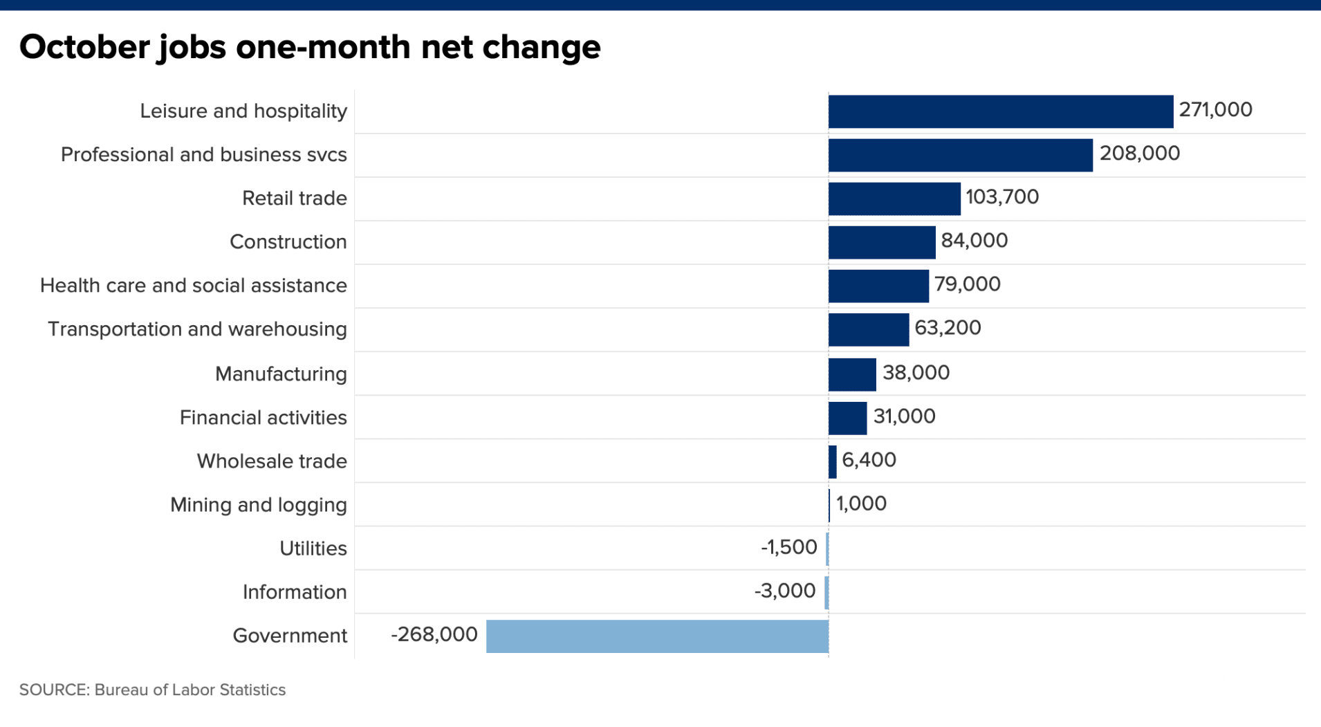 Infine arriviamo alla importante giornata del labour market report di ottobre. Una volta di più i numeri sono usciti decisamente meglio delle stime. I nuovi occupati sono cresciuti sopra le attese grazie a un numero robustissimo del settore privato, che ha assorbito i cali del settore pubblico (censimento) e del settore istruzione.