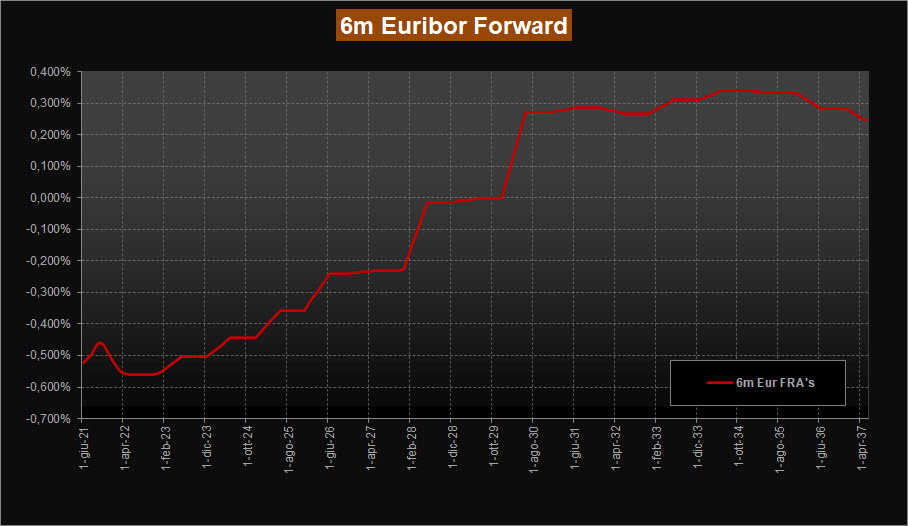 La lettura della ZC-Yield Curve, questa settimana, mostra una leggera contrazione dei rendimenti rispetto alla scorsa analisi. La sensazione è che la curva stia provando a tornare con rendimenti negativi per tutte le scadenze, anche alla luce della riunione BCE odierna che ha ulteriormente allentato le misure monetarie. La scadenza a 10 anni, sempre in territorio negativo, offre ora un rendimento in area -0,26% mentre la scadenza trentennale rimane in positivo ma si attesta ora allo 0,00% di rendimento. Nessuna particolare variazione per la forma della curva, che mantiene la sua ripidità sino alle scadenze 2038-2040 per poi presentare rendimenti decrescenti a partire dalla scadenza 2046; la curva esprime ora il massimo rendimento in area 0,03% per le scadenze 2044-2046 in leggera discesa rispetto alla scorsa rilevazione. Si contraggono anche i tassi forward su Euribor 6 mesi, che sul tratto a lunga scendono verso area 0,30%, e con il tratto a breve ora nuovamente diretto verso area -0,60%.