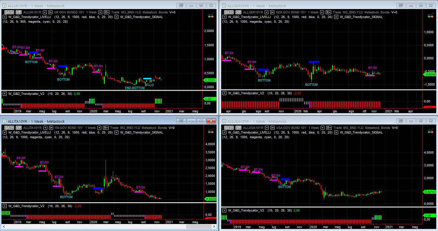 Osservando – a livello di analisi integrata – le curve dei rendimenti dei principali benchmark decennali, non osserviamo variazioni di sorta rispetto a quanto già evidenziato alcune settimane fa. Sull’area UK i rendimenti restano a contatto con la resistenza in area 0,30% confermandosi in stato LONG di Trendycator, ormai da cinque settimane. Sempre laterale il BUND, con il modello Trendycator ancora SHORT e con il rendimento del decennale tedesco in movimento oscillante tra area -0,60% e area -0,50%. Ancora bene il nostro Btp, con i rendimenti che restano sui recenti minimi e con lo spread stabile sotto i 120 bps, valori che non si vedevano dal 2018; il rendimento del decennale permane sotto lo 0,60% con Trendycator confermato sullo SHORT. Confermato il cambio di impostazione per l’area USA con i rendimenti che ora sono sopra la resistenza di breve in area 0,90% con Trendycator che indica ancora LONG.