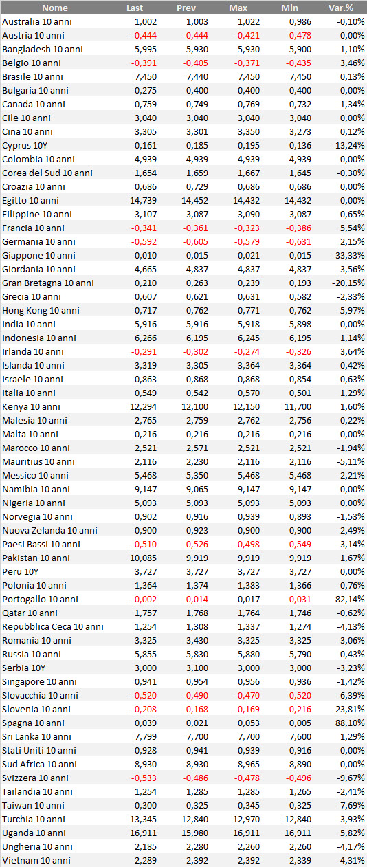 Analisi sotto forma di ranking dei bond governativi mondiali con qualunque rating. In alcuni casi, per alcuni emittenti o per alcune valute, il rapporto rischio/rendimento di questi bond può essere anche piuttosto speculativo. Il ranking considera i bond benchmark decennali in tutte le valute di emissione.