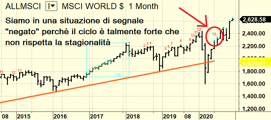 Vediamo oggi la situazione corrente del Sequential sempre sull’indice MSCI World Index. Qui la situazione è complessa e bisogna illustrarla andando oltre quello che c’è scritto sul libro di Demark. Io ho avuto la fortuna di partecipare come docente insieme a Demark al primo seminario tempo denaro reale in Italia nel lontano 1988 e posso quindi darvi qualche consiglio che va al di là della spiegazione ufficiale. Dunque il Sequential è un indicatore ciclico e ti dice quando la Borsa deve cambiare musica. Però ci sono le eccezioni: quando un ciclo finisce e il sottostante per motivi indipendenti dal ciclo (ad esempio il COVID e le politiche fiscali e monetarie espansive) e in maniera improvvisa altera il ciclo un segnale negato come quello che è avvenuto proprio nel giugno scorso in piena pandemia mondiale deve essere preso nel senso opposto. Ovvero se era un segnale di ribasso diventa un segnale di rialzo se i prezzi si portano sopra il livello indicato dal 13. Cosa che è avvenuta giusto il mese dopo.