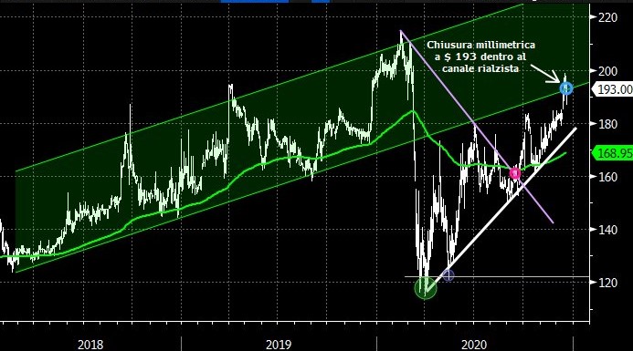 Il primo interessante step si è verificato con la rottura rialzista della trendline discendente (cerchietto fuxia nel grafico). Dopodichè, le quotazioni hanno superato anche l’importante scoglio della media mobile a 200gg (in verde). Dopo queste interessanti premesse, WINMARK ha avviato un rapido recupero che ha riportato il titolo all’interno del canale rialzista che ha visto muovere le quotazioni per circa due anni.