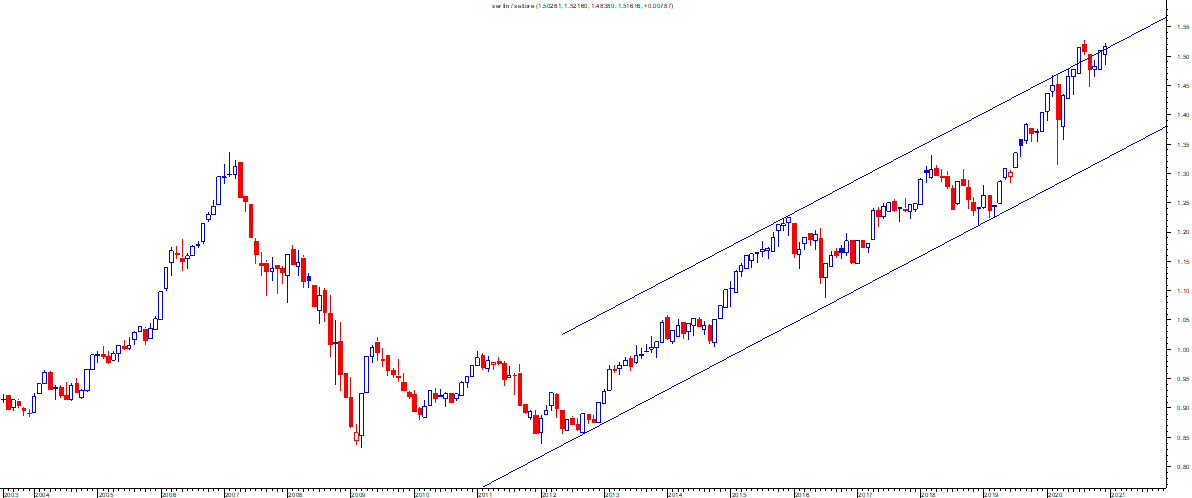 Il composite tra l’indice settoriale e l’indice generale Stoxx Europe 600 è molto interessante perché evidenzia un trend costantemente ascendente, iniziato nel mese di gennaio 2012, che ha portato all’attuale realizzazione di una serie di nuovi massimi storici. Inoltre, testa da circa 6 mesi la resistenza della tendenza in essere e potrebbe, forse anche ben presto, generare un segnale di accelerazione rialzista. Stiamo a vedere.