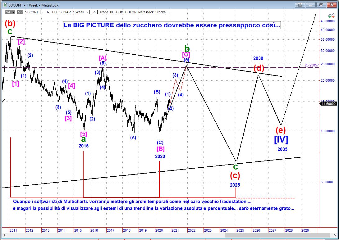 Siamo usciti bene a maggio con un buon guadagno. Dovevamo rientrare a settembre, ma dopo aver solo sfiorato il ritracciamento minimo del 38,2% è partito in quarta e ci ha lasciato fuori. Le seconde onde nella stragrande maggioranza dei casi ritracciano il 50% e ancora di più il 61,8%. Adesso si sta ripetendo il film sull’onda (3). Messo a segno l’onda 1 e un successivo ritracciamento che non raggiunge manco il 38,2%, lo zucchero sembra ripartire in quarta.
