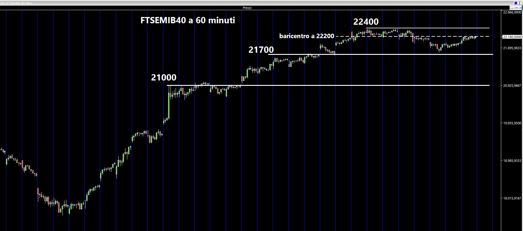 Cosa sarà successo ? Vediamolo subito sempre con un chart a 60 minuti. Le linee tratteggiate rappresentano l'andamento della settimana che si è appena conclusa. Come potete notare il gap tra 21800 e 22000 è stato chiuso millimetricamente e questo ha permesso al mercato di rimbalzare. Fino a dove però? Rimaniamo in trend rialzista chiaramente, anche se personalmente ritengo che il "famoso" rally di Natale quest'anno possa in parte venire meno per via del fatto che si è saliti già tanto. Più sedute in laterale possono servire ad accumulare e a "digerire" il corposo rialzo, a condizione naturalmente di restare in area massimi. Sul daily gli oscillatori si sono scaricati abbastanza e questo è un fatto positivo.