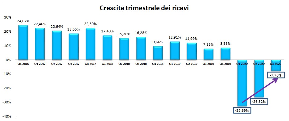 Rispetto ai primi due periodi in epoca Covid-19, l’ultimo trimestre, nonostante evidenzi ancora una contrazione della crescita, riporta un sostanziale miglioramento rispetto al passato: si è passati da un -32,92% e -26,32% ad un -7,76% .