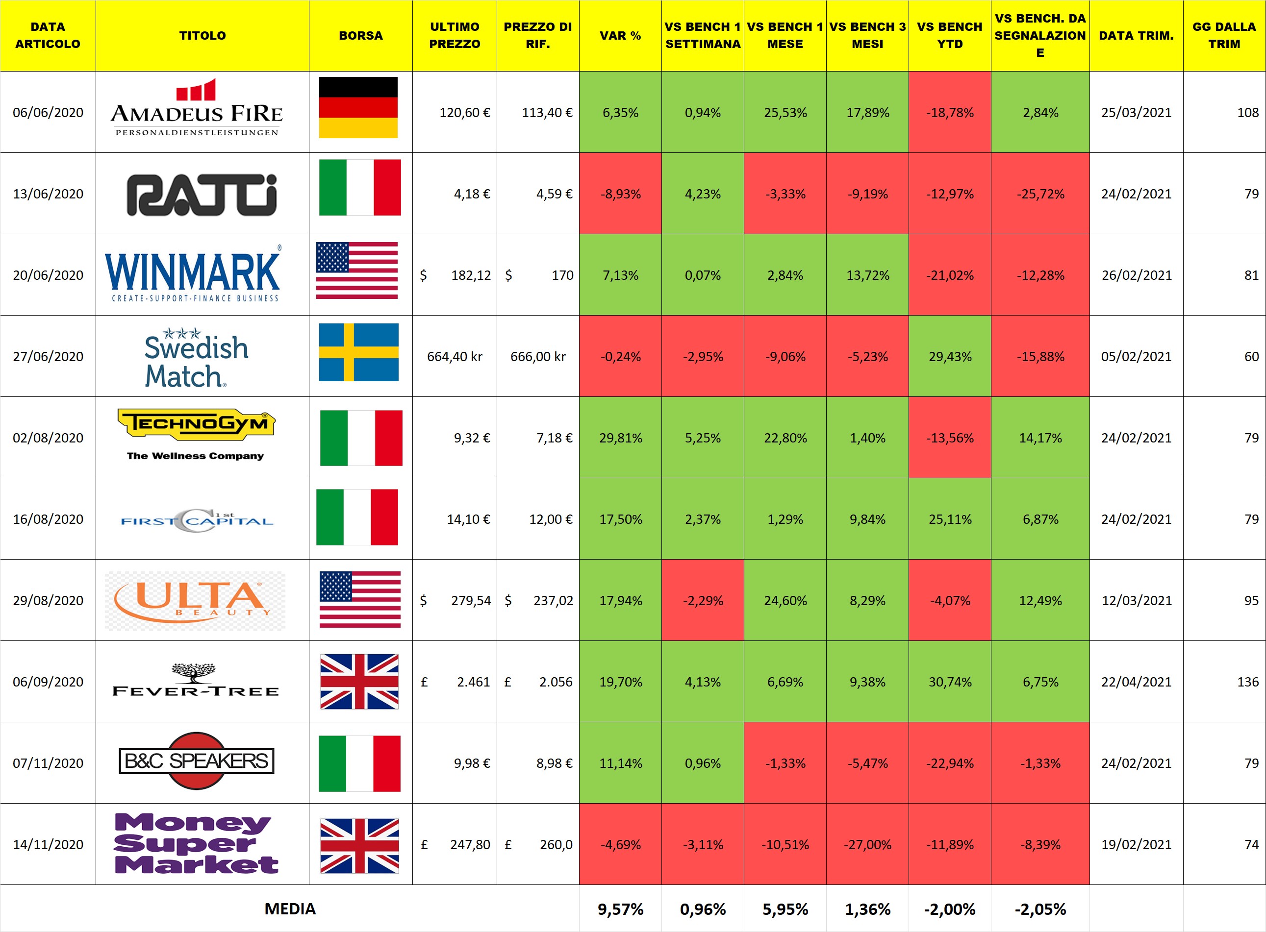 I benchmark utilizzati sono: per AMADEUS FIRE il DAX, per RATTI, TECHNOGYM e B&C SPEAKERS il FTSE Italia All-Share, per FIRST CAPITAL il FTSE Italia Small Cap Index, per WINMARK ed ULTA BEAUTY lo S&P 500, per SWEDISH MATCH l’OMX Stockholm 30, per FEVER TREE e Money Super Market il FTSE 100 UK.