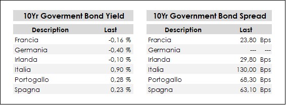 In contrazione anche i rendimenti dei governativi decennali, così come gli spread contro Bund rispetto alla scorsa lettura. Il rendimento del decennale tedesco torna a scendere in area -0,40%; il rendimento della Francia scende a -0,16% e quello dell’Irlanda va a -0,10%. Scendono anche i rendimenti della Spagna che va allo 0,23% e quelli del Portogallo che si porta allo 0,28% di rendimento. Prosegue lo stato di grazia per i nostri Btp, con il rendimento ora sceso in area 0,90%. A livello di spread Vs Bund abbiamo Portogallo, Spagna e Italia rispettivamente a 68 bps, 63 bps e 130 bps.