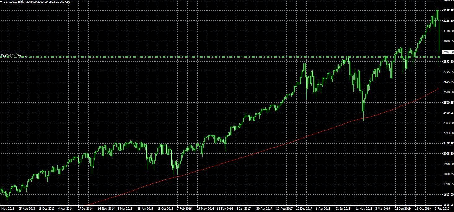 Ho fatto cenno ai margin call. Osservate cosa è successo negli Stati Uniti all'indice S&P500 e soprattutto all'ampiezza della barra settimanale. La più estesa degli ultimi dieci anni! Potrei mostrarVi il chart del Nasdaq Composite o quello del Dow Jones, ma non ci sarebbe differenza.