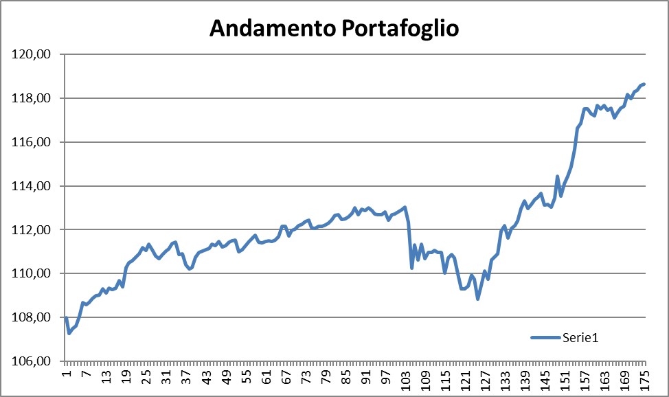 Il NAV di portafoglio vale oggi, ai prezzi correnti di mercato, 118,65 per una performance cumulata che è sempre più vicina ad un rotondo 10%. Abbiamo ancora della liquidità disponibile (circa il 10% del portafoglio), sempre preziosa e che teniamo da conto per il prossimo futuro. Stiamo infatti valutando nuovi ingressi, che diventeranno operativi appena tutti i potenziali candidati saranno analizzati e fermo restando le condizioni dei mercati.