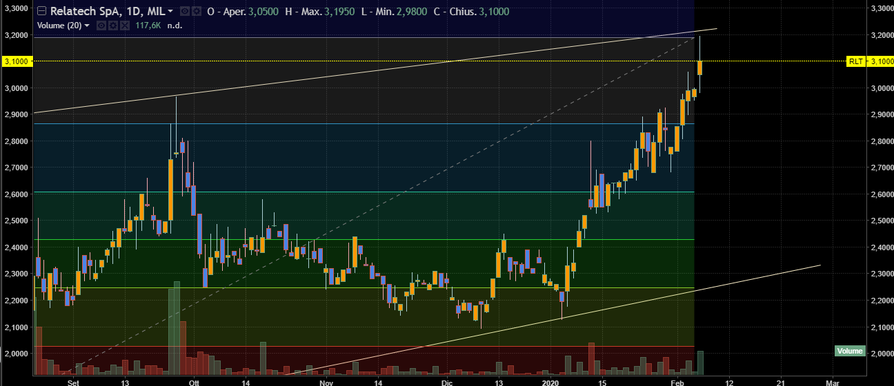Relatech è inserita in un canale rialzista che ha, come può ben desumersi dal grafico, punto di minimo ai 2.26€ per azione e punto di massimo attualmente situato in area 3.20€.