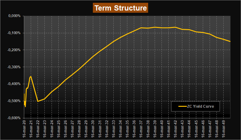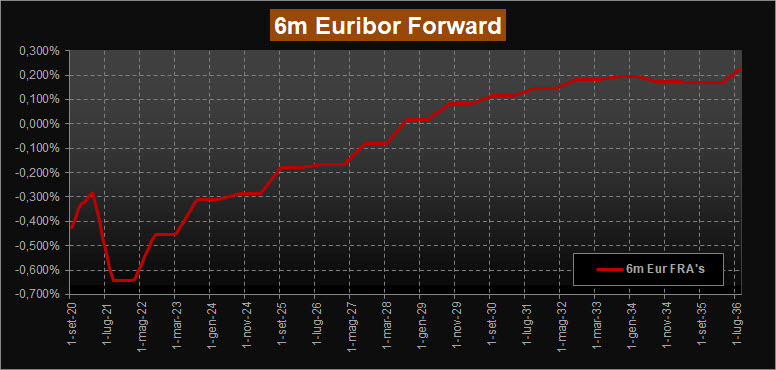 Torniamo alle nostre analisi, con la nostra consueta lettura del mercato obbligazionario attraverso la ZC-Yield Curve. Come anticipato in apertura di articolo, la situazione è “degenerata” è i rendimenti si sono affossati su nuovi minimi storici, con tutta la cura in area negativa. Ora infatti abbiamo rendimenti negativi anche sulle scadenze 2050 in area -0,15% contro area 0,11% di rendimento di una settimana fa; la scadenza a 10 scende a -0,24%. La curva cambia quindi completamente forma, diventando piuttosto ripida sul tratto a medio per poi invertire nel tratto a medio-lungo. Crollano naturalmente anche i forward su Euribor 6 mesi che sul tratto a lunga si portano ora ben sotto area 0,20% mentre sul tratto a breve ci si avvicina ad area -0,70%.