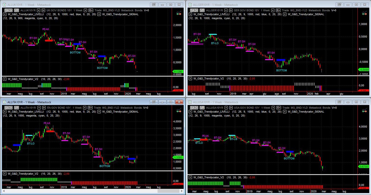 Osservando – a livello di analisi integrata – le curve dei rendimenti dei principali benchmark decennali è ben evidente lo stravolgimento repentino che ha coinvolto il mercato del reddito fisso, fornendo quindi nuove indicazioni in ottica strategica. Il modello Trendycator recepisce il cambio di scenario su tutte le aree e torna quindi SHORT su tutti i rendimenti governativi analizzati. Trendycator diventa quindi SHORT sull’area UK, con rendimenti che hanno sfondato brutalmente i minimi del 2019 e ora sono in area 0,13. Al pari, Trendycator torna SHORT sull’area BUND con il rendimento del decennale tedesco che anch’esso sfonda i minimi del 2019 a si attesta in area -0,80% di rendimento dopo una punta addirittura sotto -0,980%. Altra settimana di passione il nostro Btp, con Trendycator ancora SHORT e rendimento che ora balla tra 1,50% e 1,20%. Infine, ulteriore affondo al ribasso per i rendimenti USA, ancora su nuovi minimi ben inferiori a quelli di agosto 2019 e con Trendycator che si conferma ben saldo nello SHORT sul decennale ora sotto area 0,70%.