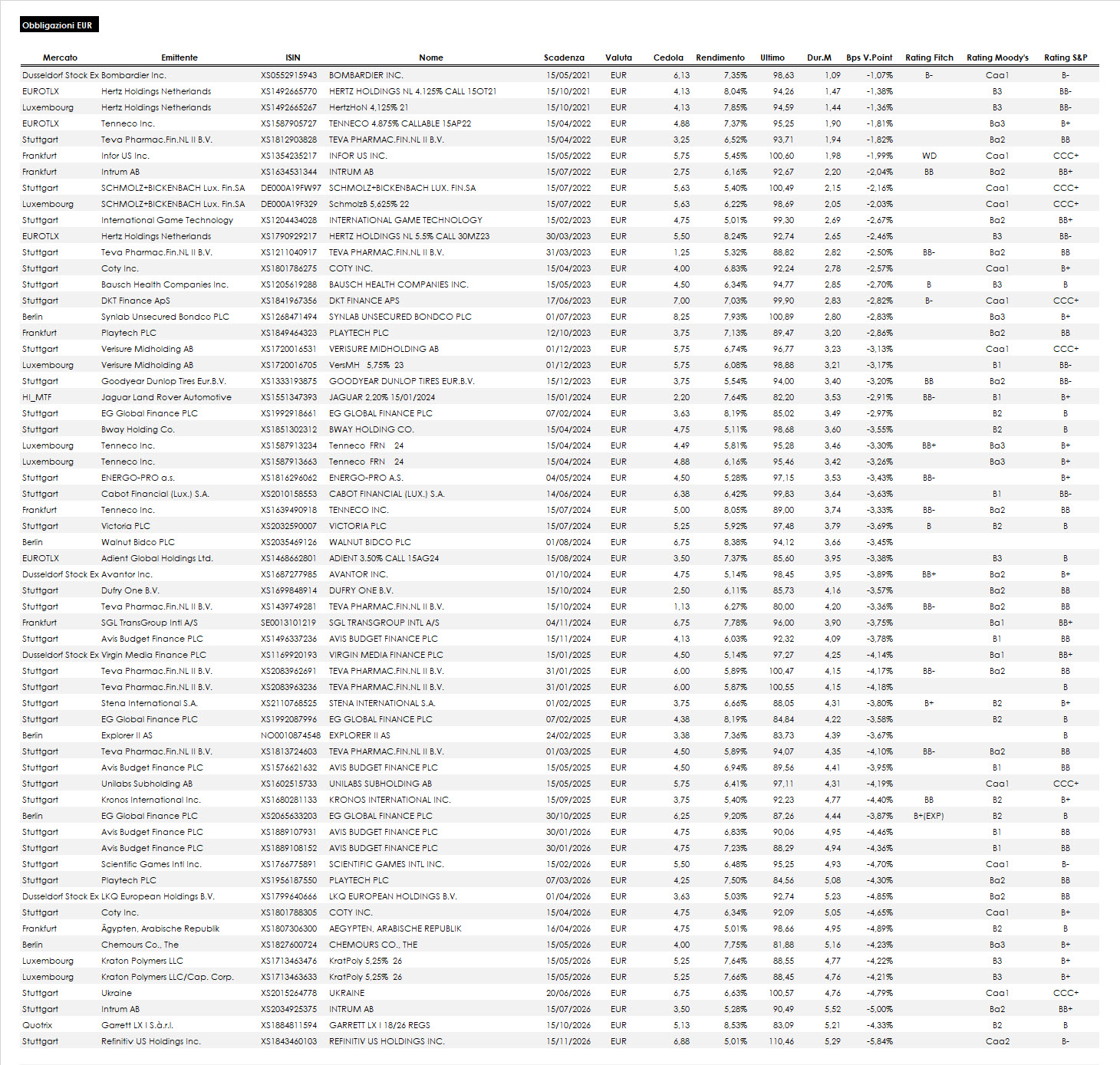 ATTENZIONE: si rammenta che i bond High Yield hanno un rischio spesso non trascurabile in termini di Credit Risk, per cui non sono da considerarsi come suggerimenti operativi, bensì come mere segnalazioni che non saranno poi seguite in modo organico. Pertanto, chi decidesse di prendere spunto da tali segnalazioni dovrà poi seguire in via autonoma l’andamento del titolo e le eventuali notizie relative all’emittente, controllando con frequenza il mercato.