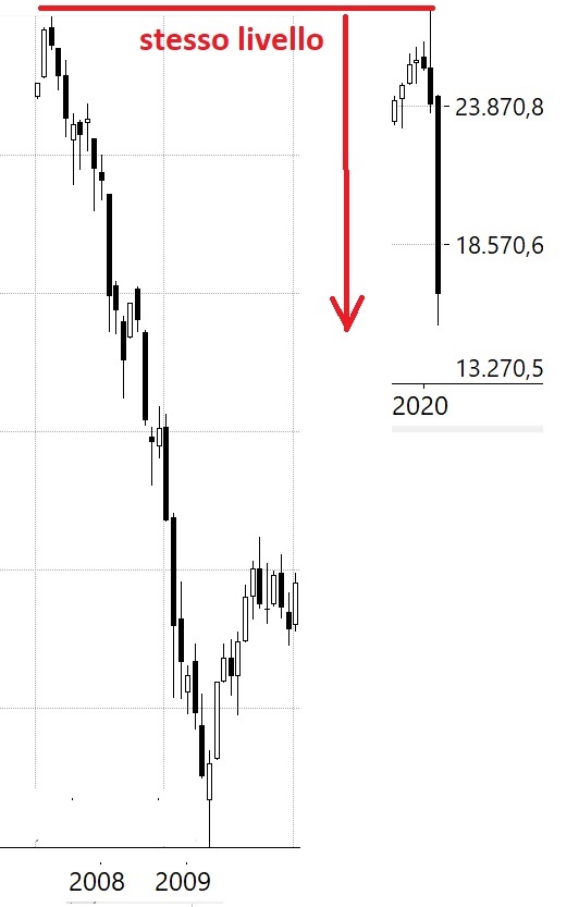 La prima cosa è la magnitudo del ribasso: se notate nel 2008 il mercato è crollato PER MOLTO TEMPO CON BARRE RELATIVAMENTE PICCOLE mentre nel 2020 è crollato PER POCO TEMPO CON BARRE ENORMI. Ho inserito i due movimenti in valore assoluto partendo dallo stesso livello in questo modo è chiaro che questa volta il poco meno di un mese abbiamo perso un terzo di quanto nel 2008 abbiamo perso dopo 2 anni di discesa ribassista.