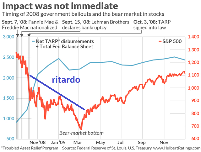 Mark Hulbert ha pubblicato un grafico molto interessante: dall’approvazione del TARP negli USA sono passati 5 mesi prima di vedere il recupero delle quotazioni ed il minimo di un bull market che è durato 11 anni.