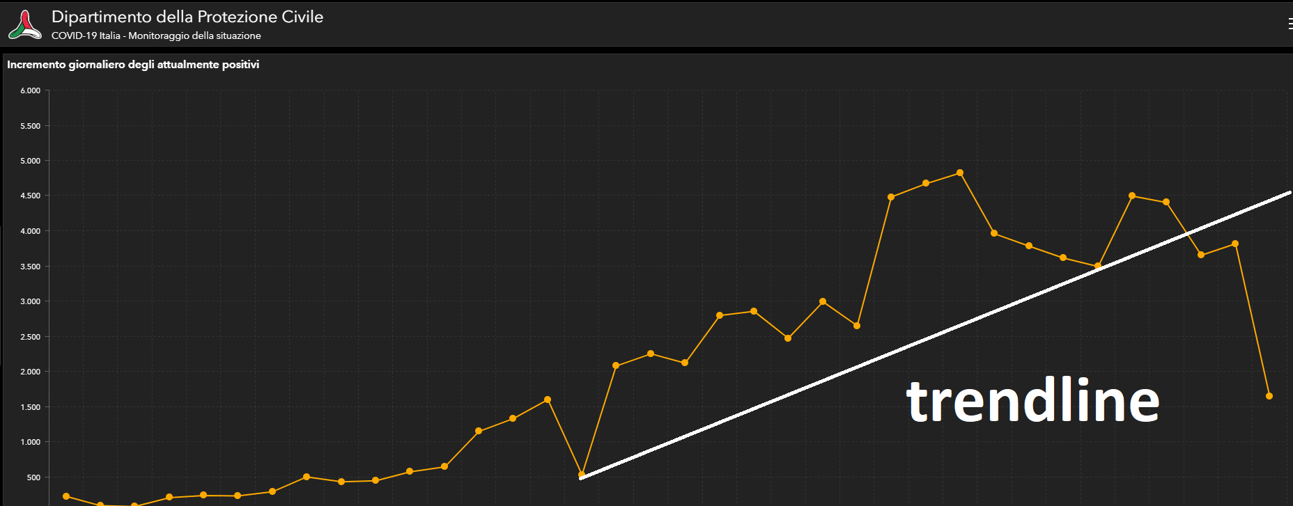 In una situazione di emergenza come questa proviamo ad osare a fare una previsione con l’analisi tecnica sul numero dei nuovi contagi: se osserviamo il grafico ieri abbiamo rotto la trendline rialzista.