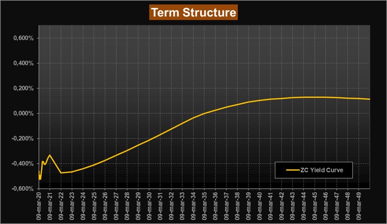 Torniamo ora alle nostre analisi, con la nostra consueta lettura del mercato obbligazionario attraverso la ZC-Yield Curve. La situazione di estrema emergenza fa crollare i rendimenti dell’area Euro, naturalmente con debite distinzioni tra Paesi, ma la risultanza è uno schiacciamento feroce su tutto il tratto di curva. Ora infatti abbiamo rendimenti negativi sino alle scadenze 2035; il tratto a lunga crolla verso area 0,11% di rendimento per le scadenze 2050; la scadenza a 10 sprofonda e si porta a -0,21%. La curva nel suo complesso torna quindi ad appiattirsi sul tratto a medio e a lunga, rimanendo un po’ più sostanzialmente invariata sulla parte a breve. Crollano anche i forward su Euribor 6 mesi che sul tratto a lunga si portano ora sotto area 0,50% mentre sul tratto a breve si torna a vedere area -0,60%.