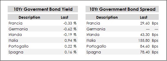 In forte contrazione anche i rendimenti dei governativi decennali, mentre allargano vistosamente gli spread contro Bund, poiché il governativo tedesco percepito come bene rifugio è stato comprato col badile. Il rendimento del decennale tedesco affonda quindi in area -0,62%; il rendimento della Francia scende a -0,33% e quello dell’Irlanda va a -0,19%. Scendono anche i rendimenti della Spagna che va allo 0,16% e quelli del Portogallo che si porta allo 0,22% di rendimento. Giornate di passione per il nostro Btp, che dopo essere stato preso di mira violentemente ha recuperato alcune posizioni e ora esprime un rendimento in area 0,94%. A livello di spread Vs Bund abbiamo Portogallo, Spagna e Italia rispettivamente a 85 bps, 78 bps e 156 bps.