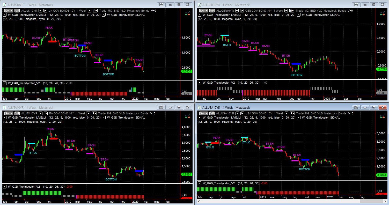 Osservando – a livello di analisi integrata – le curve dei rendimenti dei principali benchmark decennali vediamo come la situazione contingente abbia completamente stravolto l’impostazione potenziale in ottica strategica. Anche se il modello Trendycator, su alcune aree, non ha ancora “recepito” in pieno il nuovo cambio di rotta (a causa della violenza con cui sono mossi gli asset), è chiara la tendenza almeno nel breve. Il modello Trendycator si mantiene NEUTRAL sull’area UK, con rendimenti che però sono ora nei pressi dei minimi del 2019 in area 0,38. Al pari, Trendycator ancora NEUTRAL sull’area BUND con il rendimento del decennale tedesco che crolla verso i minimi del 2019 sotto area -0,60%. Settimana convulsa per il nostro Btp, con Trendycator sempre SHORT e rendimento che si ridimensiona poco sotto area 1,00%. Infine, deciso affondo al ribasso per i rendimenti USA, su nuovi minimi ben inferiori a quelli di agosto 2019 e con Trendycator che si conferma ben saldo nello SHORT sul decennale ora sotto area 1,00%.